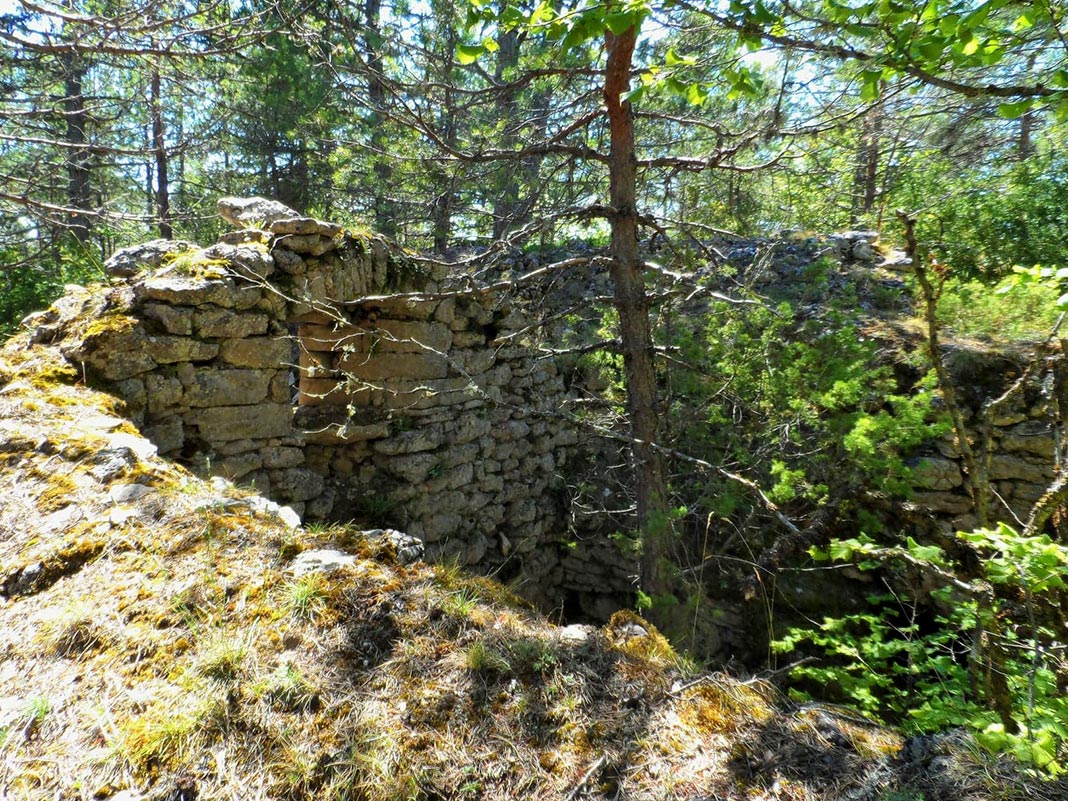 « On pourrait descendre un peu dans la grande et triste dépression de Malbouche, pour rencontrer un amas de pierres posé au niveau du sol et formant la voûte d’une maison, le bâtiment se compose d’une grande cuisine ogivale et d’une autre salle. Le mur de séparation, à demi écroulé, laisse voir une cachette ménagée derrière la cheminée au moyen de deux murailles qui se soudaient ensemble. Cette habitation souterraine est actuellement convertie en bergerie. Au siècle dernier, elle servit de repaire à Jean Grin…A quelques mètres de la construction principale se trouvent de nombreuses bâtisses en pierre sèche aux trois quarts écroulées, et qui semblent témoigner du séjour en ce lieu d’une population assez nombreuse. »